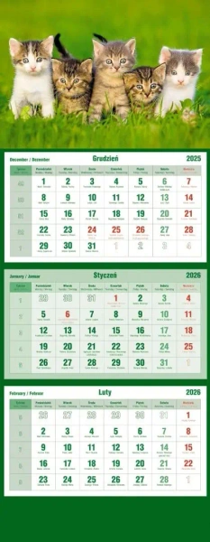 Kalendarz na rok 2023 w formacie 288 x 622 mm z motywem kotów, idealny dla miłośników tych uroczych zwierząt. Prezentuje trzy miesiące na jednej kartce, co pozwala na łatwe śledzenie najważniejszych terminów i planowanie z wyprzedzeniem. Wydrukowany na białym papierze offsetowym o gramaturze 80g/m2. Specyfikacja kalendarza:- Format: 288 x 622 mm