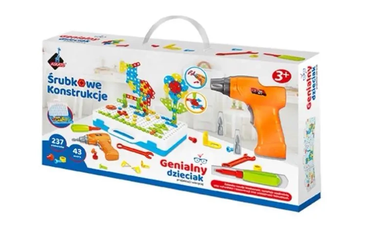 Zestaw Konstrukcje Śrubkowe Askato to doskonała zabawka edukacyjna, która umożliwia tworzenie różnych struktur za pomocą 237 elementów, takich jak śrubki, podkładki, elementy geometryczne czy łączniki. Dzięki dołączony do zestawu śrubokrętowi i wiertarce, dzieci mogą dowolnie łączyć poszczególne części, umacniając jednocześnie swoje umiejętności manualne.Rozwój kreatywności i umiejętności dziecka