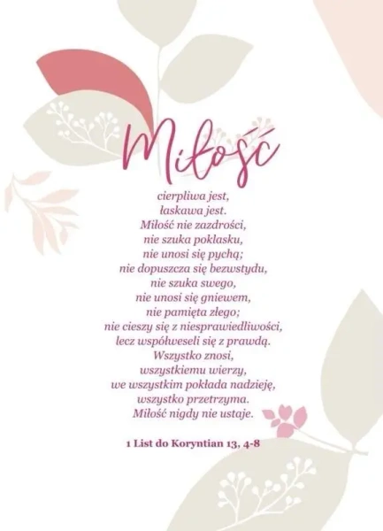 Kartka składana, dodatkowo załączona jest do niej koperta. Na kartce znajduje się hymn o miłości, który pochodzi z 13 rozdziału I Listu do Koryntian. Możliwość wpisania własnego tekstu czy życzeń sprawia, że jest to idealny wybór na prezent dla bliskiej osoby, na każdą okazję. Twoje spersonalizowane wiadomości będą idealnie komponować się z wymownym cytatem na temat miłości.. Ta uniwersalna kartka to doskonały sposób na wyrażenie uczuć w niepowtarzalny sposób. Kartka składana z hymnem o miłości to coś więcej niż tylko zwykły list - to piękna forma przekazania miłości i szacunku dla drugiej osoby.EAN: 5902574164780