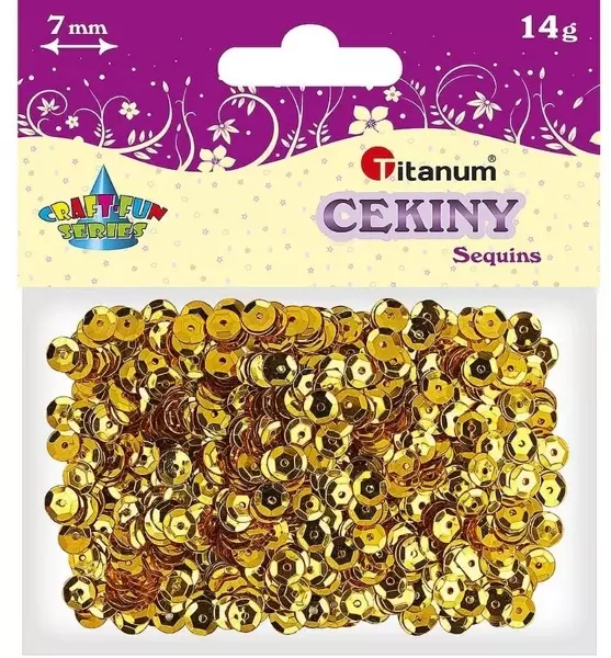 Urocze, okrągłe cekiny o średnicy 7 mm w kolorze metallicznym złotym. Idealne do wszelkiego rodzaju dekoracji, rękodzieła oraz ozdabiania ubrań. Opakowanie zawiera 14 g tych stylowych cekinów. Dodaj trochę blasku i szyku do swoich projektów artystycznych z łatwością, dzięki tym efektownym cekinom!EAN: 5907437649541