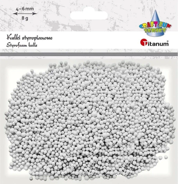 Prezentujemy białe kulki styropianowe o średnicy zbliżonej do 4-6 mm, zapakowane w praktyczne opakowanie o wadze 8 gram. Te niezwykle wszechstronne i przydatne produkty sprawdzą się w wielu zastosowaniach!