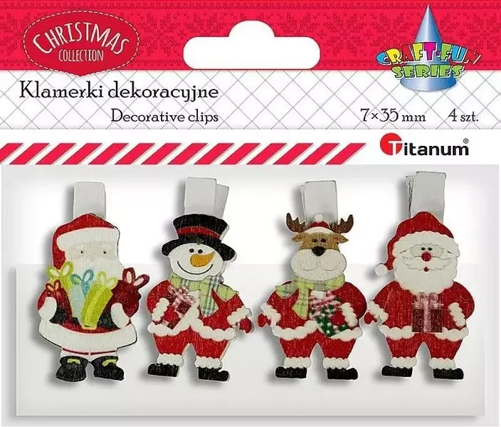 Drewniane klamerki z dekorem to idealne rozwiązanie dla osób ceniących się oryginalne i funkcjonalne dodatki. Wykorzystasz je do przymocowania zdjęć, karteczek na prezentach czy winietek na stole. Ponadto świetnie sprawdzą się jako dekoracja stroików, bukietów, doniczek czy kartek z życzeniami. To także doskonałe uzupełnienie techniki scrapbookingu. Klamerki Titanum są białe z uroczymi dekoracjami przedstawiającymi Mikołaja, bałwanka i renifera. Każda klamerka ma wymiar 7x35mm, co sprawia, że są zarówno subtelne i eleganckie, jak i praktyczne. W opakowaniu znajdują się 4 sztuki, a ich kolorystyka została dobrana w mixie, aby nadać każdemu urokliwego wyglądu. Wybierz drewniane klamerki z dekorem Titanum i dodaj nieco magii do swoich codziennych uroków. Stwórz indywidualny klimat we wnętrzu, podkreślając własny styl oraz niezapomniane chwile, które warto cieszyć się.EAN: 5907437723913