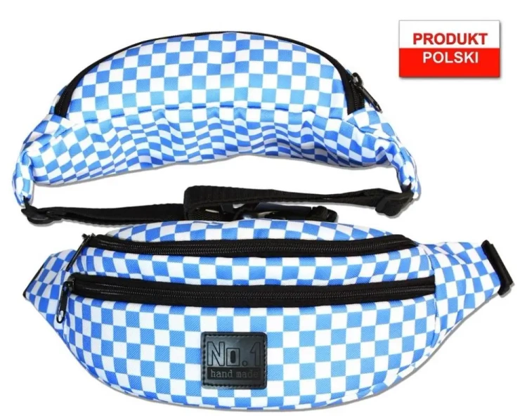 Prezentujemy Państwu saszetkę-nerkę o wymiarach 35x14x8cm, którą cechuje trwałość i funkcjonalność. Wykonana z wysokiej jakości kodury, materiału znanego ze swojej wytrzymałości na ścieranie i uszkodzenia. Wyrób wyróżnia się ciekawym niebieskim kolorem i ozdobnym nadrukiem w postaci kraty, naniesionym za pomocą technologii sublimacji.Dwie niezależne komory z zamkami błyskawicznymi