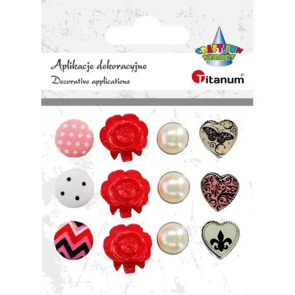 Zestaw składa się z 12 ćwieków w czterech różnych wzorach. Do wyboru mamy następujące modele: okrągłe ćwieki o średnicy 14mm, wykonane z materiału, eleganckie ćwieki w kształcie róż o średnicy 17mm, zwieńczone perłą umieszczoną w metalowej oprawie o średnicy 13mm, a także romantyczne ćwieki w kształcie serca o wymiarach 15x15mm. W każdym wzorze dostępne są trzy sztuki, dzięki czemu z łatwością dobierzesz dokładnie taki model, jaki jest Ci potrzebny na daną okazję.EAN: 5907437711460