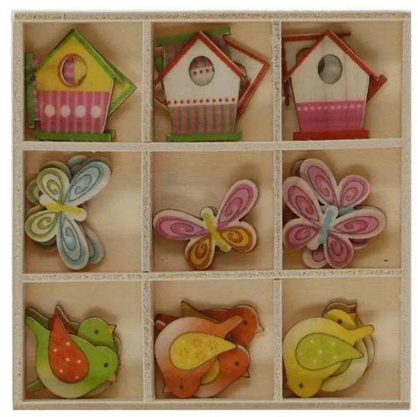 Zestaw 27 drewnianych ozdób to idealne rozwiązanie dla osób poszukujących oryginalnych i ekologicznych akcentów dekoracyjnych. Prezentowany produkt składa się z pięknych, kolorowych dekoracji utrzymanych w trzech różnych wzorach, a ich różnorodność sprawia, że z powodzeniem można je wykorzystać do ozdabiania różnych miejsc i przedmiotów. W zestawie znajdują się po 9 egzemplarzy każdego z trzech wzorów: - 105x105mm drewniane pudełko, - urocze, miniaturowe budki dla ptaków o wymiarach 27x30mm, - przepiękne, stylowe motyle o rozmiarach 30x28mm, - sympatyczne, małe ptaszki mierzące 29x20mm. Dekoracje wykonane są z ekologicznej sklejki o grubości 1mm, co gwarantuje lekkość oraz łatwość w montażu. Ozdoby te można wykorzystać w wielu różnych scenariuszach dekoracyjnych, takich jak ozdabianie wnętrz, tworzenie kompozycji na donicach czy dekorowanie prezentów. Estetyczne drewniane pudełko dostarczone w komplecie to nie tylko praktyczne opakowanie na dekoracje, ale również elegancki dodatek do wystroju wnętrza, który podkreśli twórczą atmosferę otoczenia.EAN: 5907437720431