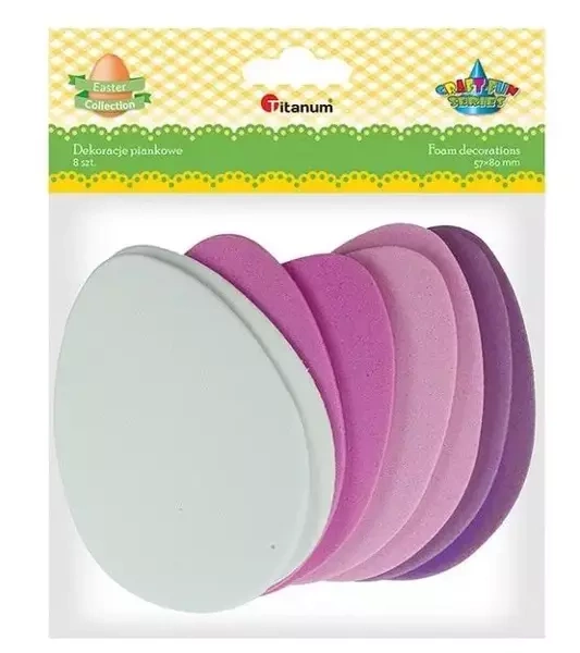 Prezentujemy zestaw 8 piankowych jaj o wymiarach 57x80mm, dostępnych w różnorodnych kolorach: 2 w odcieniu białym, 2 różowe, 2 jasnoróżowe oraz 2 fioletowe. Doskonałe do dekoracji, prac plastycznych lub innych kreatywnych zastosowań. Idealne zarówno dla dzieci, jak i dorosłych.