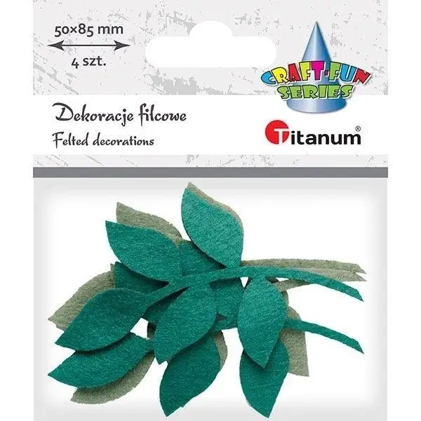 Oto atrakcyjna dekoracja od Titanum, wykonana z wysokiej jakości filcu o grubości 1 mm. Prezentowane filcowe liście na gałązkę są dostępne w dwóch kolorach: ciemnozielonym oraz zgaszonym zielonym. Produkt sprzedawany jest w zestawie składającym się z 4 sztuk. Każdy z liści wraz z gałązką ma wymiar 50 x 85 mm. Filcowe ozdoby to doskonałe rozwiązanie dla tych, którzy szukają oryginalnych i trwałych dodatków do aranżacji wnętrz lub do przedszkoli. Zastosowanie filcu sprawia, że liście są miłe w dotyku i bezpieczne dla dzieci. Wybierz te estetyczne filcowe liście na gałązkę od Titanum i ciesz się wyjątkową dekoracją we wnętrzach! Prościej tego nie można!EAN: 5907437731222