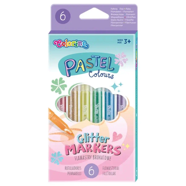 Odkryj flamastry brokatowe Colorino Kids dostępne w zestawie sześciu pastelowych barw. Ich unikalnym atrybutem jest wyjątkowo duża ilość drobinek błyszczącego brokatu. To sprawia, że kolory są wyraziste i efektownie błyszczą, niezależnie czy rysujemy na białej, czy kolorowej powierzchni.Ozdób swoje rysunki