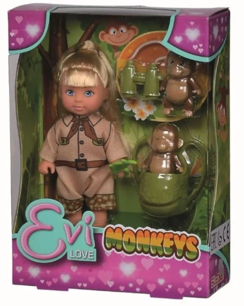 Wyobraź sobie zabawę z laleczką Evi, która wyrusza na egzotyczną wyprawę w niezwykłe zakątki świata. Przygotowana na każdą przygodę, ubrana w wygodne obuwie i wyposażona w plecak, gotowa jest do odkrywania nieznanego. Nieodłącznym elementem jej podróży jest lornetka, dzięki której może przyjrzeć się niezwykłym gatunkom zwierząt na swojej drodze. Razem z nią w świat ruszają dwie sympatyczne małpki, które wesoło bawią się i odkrywają tajemnice przyrody.