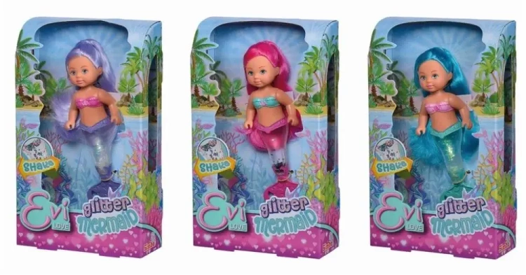Wysokość lalek Evi to 14 cm, a zalecany wiek dla dzieci to 3 lata+. Te brokatowe syrenki doskonale sprawdzą się jako zabawka dla dzieci, dodając uroku podwodnemu świecie marzeń i fantazji.