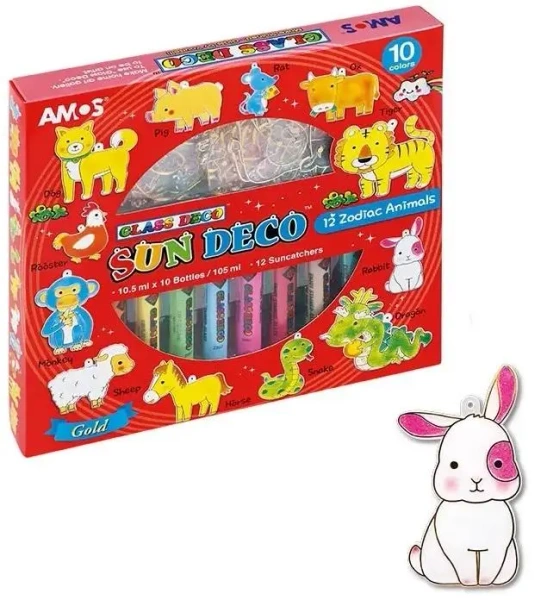 W zestawie znajduje się aż 12 gotowych witraży przedstawiających chińskie znaki zodiaku, breloczki do pomalowania oraz 10 kolorów farb.O pojemności 10 x 10,5 ml.