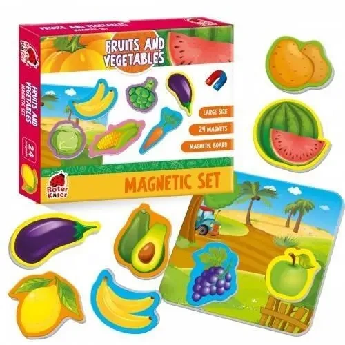 Owoce i warzywa mają wiele smaków: słodkie, kwaśne, gorzkie! Ten zestaw magnesów od Roter Käfer pomoże dzieciom zgłębić fascynujący świat różnych owoców i warzyw. Poznajcie ich nazwy, nauczcie się, co one jedzą i jak się komunikują oraz zapamiętajcie ich właściwości. W zestawie znajduje się również magnetyczna tablica z obrazem malowniczego pejzażu. Dzieci mogą bawić się zarówno na tej specjalnej tablicy, jak i na dowolnej innej magnetycznej powierzchni. Grać z zestawem magnesów to nie tylko zabawa, ale też sposób na rozwijanie logiki, wyobraźni, pamięci oraz drobnej motoryki. W skład zestawu wchodzi:- 24 magnesy z różnymi owocami i warzywami
