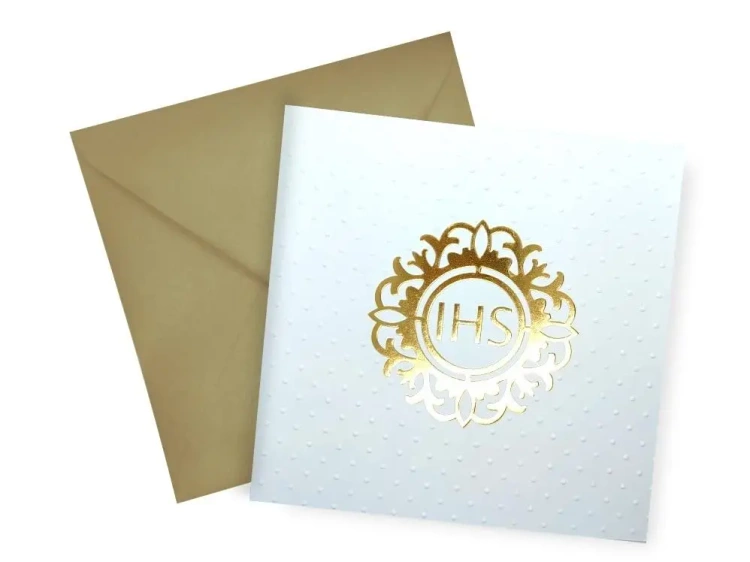 Prezentujemy karton o wymiarach 15 x 15 cm. Użytkownik otrzymuje go wydrukowanego na papierze o wyjątkowej jakości. Jego wygląd jest dodatkowo podkreślony przez nałożenie złotego, metalicznego lakieru 3D, który nadaje kartonowi efektu głębi. W komplecie znajduje się elegancka, perłowa koperta.Cechy Kartonu Komunijnego KW z IHS