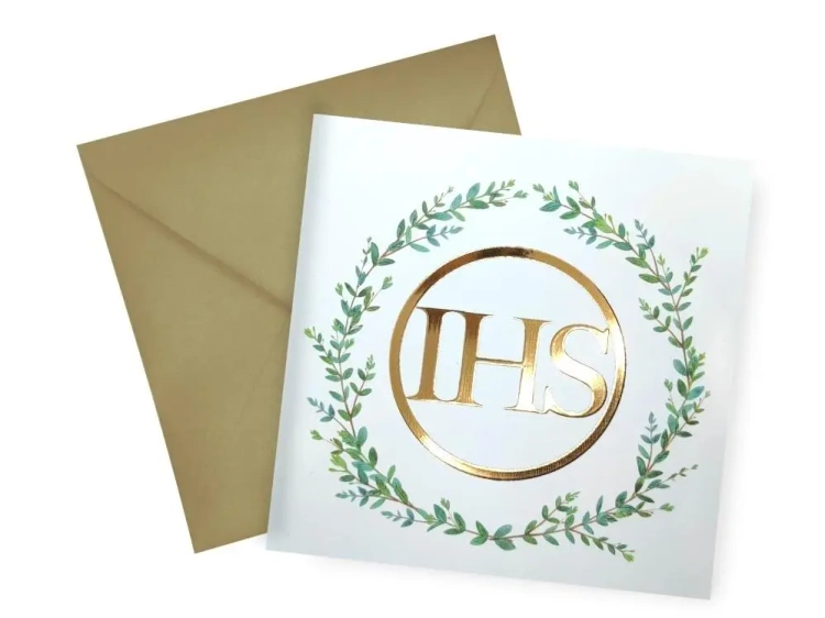 Ręcznie wykonana kartka 15 x15 cm, zwana również karnetem. Wykonana jest na papierze premium. Dekorowana specjalnym złotym lakierem typu 3D. Zestaw zawiera również dołączoną perłową kopertę. Elegancki wygląd kartki i wysokiej jakości materiały, z których została wykonana, sprawiają, że jest doskonałym wyborem na ważne okazje takie jak Komunia Święta. Jest unikalna, a jej piękno jest dodatkowo podkreślone przez detale w postaci liści udekorowanych złotym lakierem metalicznym 3D. Wysyłana jest w perłowej kopercie, która dodaje elegancji całemu zestawowi.EAN: 5907465663229