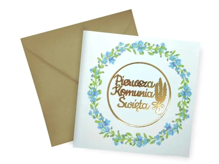 Niezapomniany karnet komunijny o wymiarach 15 x 15 cm został zaprojektowany na papierze o wysokiej jakości. Wyrafinowanie tego produktu podkreśla jej awangardowy styl, który został wzbogacony o złoty metaliczny lakier 3D. Taki dodatek nadaje jej unikalnego, wyróżniającego się sznytu. W zestawie z karnetem otrzymasz również perłową kopertę. Idealnie dopełni ona całość prezentu, podkreślając elegancki charakter tej wyjątkowej kompozycji. Sam karnet, jak i koperta tworzą perfekcyjnie skomponowany duet. Przemyślana estetyka wykonania i dbałość o szereg drobnych detali sprawiają, że ten produkt jest idealnym wyborem na wyjątkową okazję, jaką jest Komunia Święta. Stanowi doskonały balans pomiędzy elegancją a nowoczesnością.EAN: 5907465663243