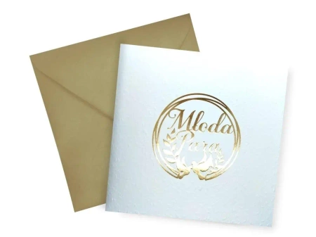 Prezentowany karnet ma wymiary 15 x 15 cm. Wykonany jest z papieru o bardzo dobrej jakości, na którym wydrukowany jest wzór para młoda.Wykończenie złotym, metalicznym lakierem 3D
