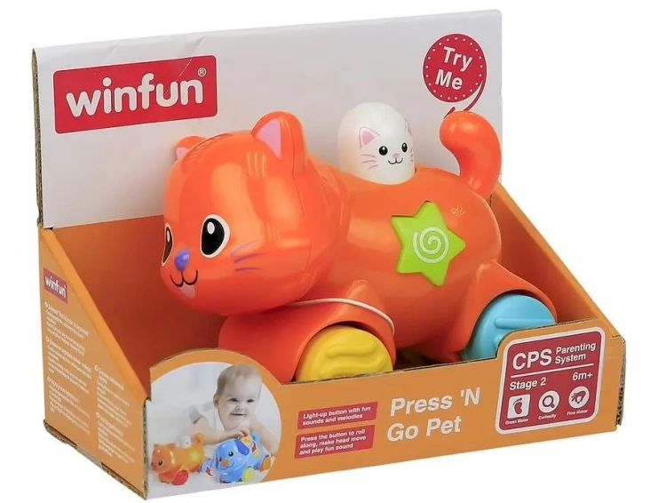 Twoje dziecko zyskuje:- Poznaje radość z raczkujących przygod za śmigającym kotkiem, jednocześnie ćwicząc mięśnie i zdolność utrzymania kierunku ruchu.