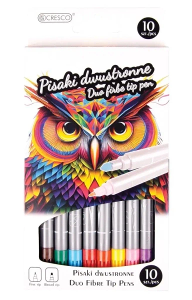 Pisaki są dostarczane w praktycznym, kartonowym opakowaniu idealnym do przechowywania. Na końcu każdego pisaka znajdują się dwie końcówki - gruba i cienka, dzięki czemu nadają się do różnorodnych technik rysowania. Kolorystyka to zróżnicowany mix 10 kolorów, który zadowoli nawet najbardziej wymagających.EAN: 5907464200760