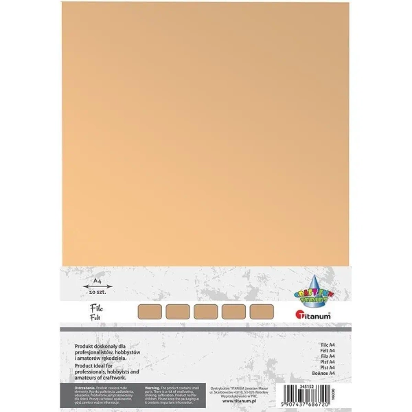 Filc o wymiarach A4 i grubości 2mm, o gramaturze 200g, dostępny w zestawie składającym się z 10 sztuk, w żywym kolorze pomarańczowym. Idealny do wykorzystania w przeróżnych projektach kreatywnych, lekki i elastyczny - świetny wybór dla wszystkich, którzy poszukują trwałego i estetycznego materiału do swoich dzieł.EAN: 5907437686720