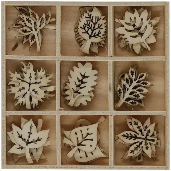 Zestaw zawiera 45 naturalnych drewnianych dekoracji, wykonanych z 1 mm sklejki. W pudełku o wymiarach 105x105 mm znajdziesz aż 9 różnych wzorów dekoracji w ilości pięciu sztuk każdy. Wszystkie wzory to motywy liści, które doskonale sprawdzą się jako estetyczne i przyjemne dla oka ozdoby w Twoim domu.
