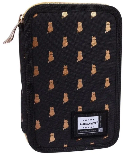 Zaprojektowany z myślą o miłośnikach futrzaków, czarny podwójny piórnik Head jest ozdobiony słodkim motywem małych złotych kotków. Ten wyjątkowy wzór wygląda tak, jakby cały piórnik był obsypany mnóstwem niewielkich, błyszczących medalionów. Chociaż piórnik Head nie zawiera akcesoriów, jego dwie przestronne komory zapewniają wystarczającą ilość miejsca na niezbędne narzędzia, takie jak kredki, flamastry, ołówki, długopisy i linijki.Cechy produktu