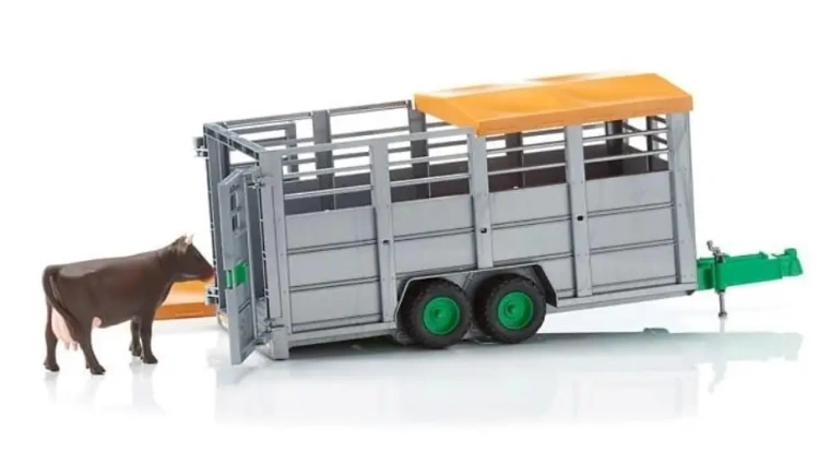 Zabawka edukacyjna: Przyczepa 2-osiowa do przewozu krów z figurką krowy marki Bruder