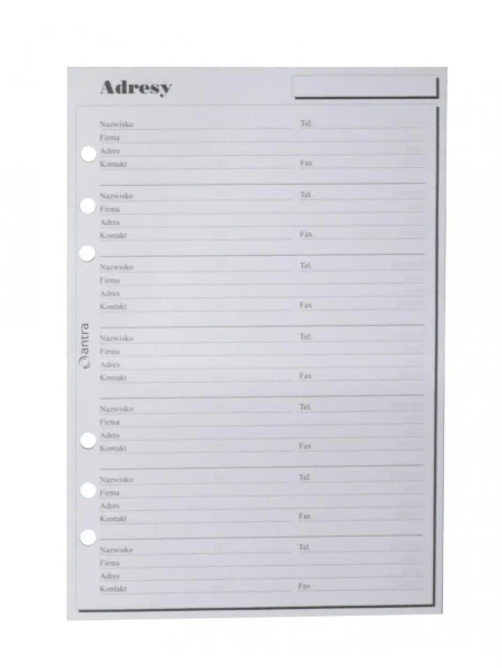 Oferowany wkład do organizerów A5, o wymiarach 21x14,4 cm, to niezbędny element porządkujący informacje na temat adresów, do jakich wracamy. Z łatwością umieścisz go w dowolnym organizerze o odpowiednim formacie. Wkład Adresy pozwoli Ci zachować porządek w notowanych adresach, zapewniając szybki dostęp do potrzebnych informacji. Funktionalny i praktyczny, stanowi nieodłączny element zarówno profesjonalnego, jak i osobistego planowania. Dzięki temu wkładowi, żadne dane kontaktowe nie zostaną zapomniane ani pominięte. Pamiętaj, że odpowiednio zarządzane informacje to klucz do skuteczności. Zachęcamy do wykorzystania naszych wkładów, które pomogą Ci lepiej zorganizować przestrzeń pracy i codzienne obowiązki.EAN: 5904210000445