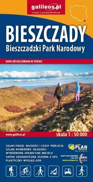 Mapa swym zasięgiem obejmuje obszar od Woli Michowskiej do Tarnawy Niżnej oraz od Worka Bieszczadzkiego do Jeziora Solińskiego. Są tu wszystkie połoniny: Wetlińska, Caryńska, Bukowska, Dźwinicka, Tarnica, Szeroki Wierch, Mała i Duża Rawka oraz Pasmo Jeleniowatego (obok Mucznego) z nowo wybudowaną wieżą widokową. Worek Bieszczadzki pokazano na osobnym kartoniku. Pokazano tu wszystkie szlaki i ścieżki dydaktyczne z ich długościami i czasami przejść. Przy trasach rowerowych podano ich długości. Ponadto na mapie zaznaczono wszystkie informacje potrzebne turyście. Zastosowany nowatorski sposób cieniowania zboczy górskich bardzo podniósł plastyczność mapy. Są widoczne wszystkie grzbiety górskie, szczyty, doliny, niecki i wypłaszczenia. Nie potrzeba umiejętności czytania warstwic, aby zobaczyć bardzo precyzyjnie ukształtowanie terenu.
