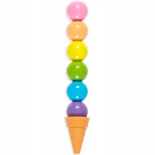 Różnokolorowe, przekładane kredki w kształcie kulistych lodów to świetna zabawa dla Twojego dziecka. Maluch może układać je jedną na drugiej, tworząc własne, jedyne w swoim rodzaju kombinacje. W zestawie znajduje się 6 gałek, a każda z nich to inny kolor do kolorowania, który dziecko może z łatwością usunąć przy pomocy gumki w kształcie stożka. Dodatkowo, gumka posiada subtelny, waniliowy zapach. Pozwól malcowi na twórczą zabawę i pozwól mu ułożyć własne, kolorowe kompozycje!Cechy produktu