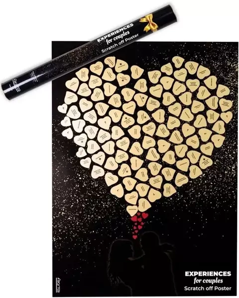 Plakat Zdrapka Przeżyć dla Pary to:- Czarny plakat pokryty specjalną, złotą powłoką do zdrapywania