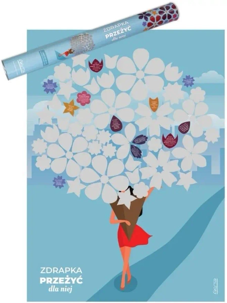 Już na pierwszy rzut oka plakat zdrapka prezentuje kobietę trzymającą bujny bukiet kwiatów. Lecz za srebrzonymi elementami tego dzieła kryje się jednak cała gama niezapomnianych przeżyć. W miarę zdrapywania każdy element odkrywa nowe, niosące inspirację zadanie. Każde z nich ma na celu pobudzić Cię do pozyskania dobrobytu w różnych obszarach - ciała, umysłu, duszy, czy relacji z innymi. Plakat zdrapka może zainspirować Cię do wykreowania własnych zadań i realnych celów na przyszłość. Zabawa zapewnia długotrwałe, znaczące doświadczenia.Co znajdziesz w Zdrapce Przeżyć dla Niej: