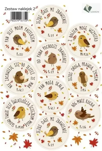 Zachwycające ptaszki to tło wspaniałego zbioru 12 naklejek z motywami zaczerpniętymi z doktryny chrześcijańskiej. Na każdej z nich znajduje się inny tekst, są to między innymi: Jezus jest moją drogą do zbawieniaJezus – moja droga, prawda i życie
