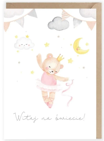Przedstawiam Państwu uroczo zaprojektowaną kartkę okolicznościową od firmy Cardie. Chodzi o klasyczny, otwierany model w formacie A6, który na okładce ma słodką grafikę idealnie pasującą do narodzin dziewczynki. Wnętrze kartki jest czyste, co daje możliwość wpisania własnych życzeń, unikalnej dedykacji czy osobistych, ciepłych słów.