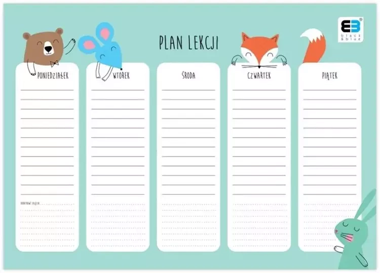 Zestaw zawiera 10 sztuk planu lekcji o wartości użytkowej oraz estetycznej. Idealny do szkoły, planer posiada również miejsce na notatki, co czyni go niezwykle funkcjonalnym. Doskonały plan lekcji dla dzieci, wykonany z papieru kredowego, co zapewnia trwałość i wytrzymałość produktu. Praktyczny format A4 ułatwia przechowywanie i transportowanie planu lekcji oraz jego wykorzystanie na co dzień.