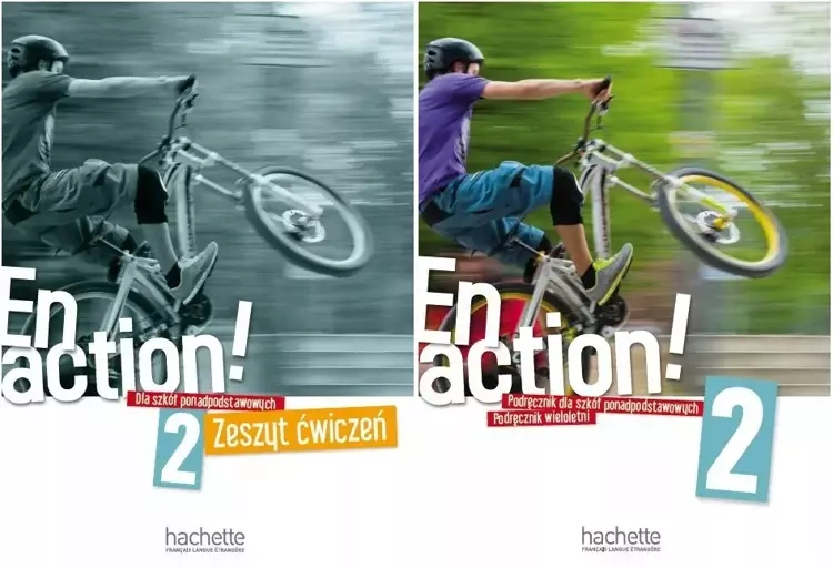 En Action 2 podręcznik wieloletni dla szkół ponadpodstawowych Podręcznik dopuszczony do użytku szkolnego w 4-letnim liceum i 5-letnim technikim. Nagrania audio mp3 do bezpłatnego pobrania ze strony www. En Action! to nowoczesny kurs dla uczniów szkół ponadpodstawowych, rozpoczynających bądź kontynuujących naukę języka francuskiego. Opracowane dla współczesnego licealisty tematy, solidna baza gramatyczna i leksykalna zmotywują ucznia dla nauki języka i umożliwią mu przygotowanie się do egzaminu maturalnego, zarówno w części ustnej, jak i pisemnej. Szeroka gama nowoczesnych komponentów dydaktycznych dla ucznia i nauczyciela umożliwia dostosowanie kursu do potrzeb, zainteresowań i zaawansowania językowego grupy. Nagrania mp3 znajdują się na stronie: https://www.hachettefle.pl/podrecznik_en_action oraz w aplikacji MEDIA+ Komponenty w serii En Action! 2: - podręcznik ucznia + nagrania audio mp3 on-line, - zeszyt ćwiczeń + nagrania audio mp3 on-line, - płyta DVD-Rom "Ressources pdagogiques complmentaires pour la classe" z kodem do pobrania podręcznika interaktywnego.