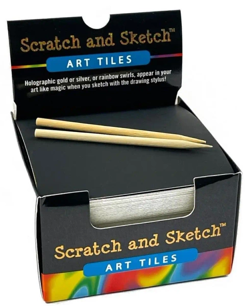 Zdobyłeś zestaw kreatywnego narzędzia od Peter Pauper Press - Zdrapywanka Artystyczna. W pakiecie oczekuje na Ciebie 150 stron do eksploracji i 2 specjalnie zaprojektowane rysiki do zdrapywania. Zadanie polega na odkryciu ukrytego pod czarną powierzchnią 50 arkuszy złotego hologramu, 50 srebrnego hologramu plus 50 z tęczowym tłem.
