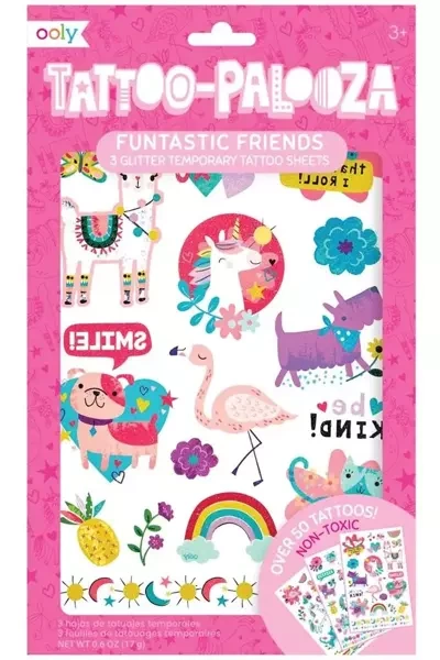 Przedstawiamy Ooly Tattoo Palooza - zestaw ponad 50 barwnych, zabawnych tatuaży dla najmłodszych, zgromadzonych na trzech arkuszach o wymiarach 13x21 cm każdy. Są one proste w użyciu oraz łatwo zmywalne, co sprawia, że stanowią doskonały sposób na kreatywną zabawę!