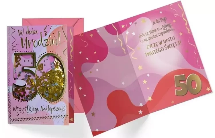 Nasz produkt prezentuje się imponująco po złożeniu, a jego wielkość to 16.6 x 11.7 cm. Nikogo nie powinny zaskoczyć także ulotne akcenty, takie jak dodatkowe przyklejane ozdoby, stojaczki czy elementy biżuteryjne. Co więcej, każda kartka z naszej serii Konfetti Kukartka jest dostarczana kompletnie z kolorową kopertą. Cieszą się one popularnością zarówno jako dodatek do prezentu, jak i samodzielne upominki - z pewnością przypadną do gustu solenizantce obchodzącej 50-te urodziny! Parametry Produktu: Wymiary: - Rozmiar po złożeniu: orientacyjnie B6 (16.6 x 11.7 cm) Zdobienia: - Błyszczące konfetti i inne dekoracje, które są różne w zależności od wybranego wzoru Dodatkowe elementy: - Kolorowa koperta w zestawieEAN: 5901924472315