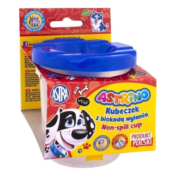 Kubeczek do przemywania pędzli Astrino to niezbędne narzędzie dla każdego szkolnego artysty. Wyposażony jest w innowacyjną pokrywkę, która zapobiega niezamierzonemu wylaniu zawartości. Dodatkowo posiada praktyczne miejsce na odłożenie aż 4 czterech pędzli podczas pracy.EAN: 5901137164267