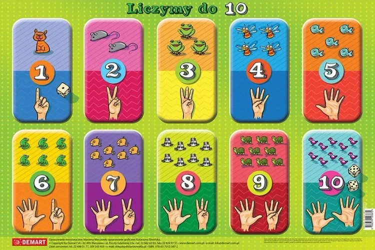 Podkładka przeznaczona jest dla dzieci w wieku 46 lat. Pomaga w poznawaniu liczb od 1 do 10 i w zrozumieniu pojęcia liczby w ogóle. Pola przypominające duże przyciski podzielono na dwie części. W górnej umieszczono proste rysunki interpretujące poszczególne liczby naturalne, np. dziewięć żółwi przy dziewiątce czy dwie myszki przy dwójce. W dolnej zaś ponownie zilustrowano każdą liczbę tym razem za pomocą wyprostowanych palców dłoni. Dzięki temu dziecko może więc łatwiej zrozumieć pojęcie więcej i mniej, bo może naśladować interpretację liczby własnymi rękami. Na środku przycisku w kółeczku jest zapis cyfrowy każdej liczby, więc przy dziesiątce pojawia się zero (Tu można bardziej zainteresowanych wdrażać nawet w zapis liczb dwucyfrowych). Można też spróbować z dzieckiem pobawić się kostkami do gry, co właśnie sugerują rozrzucone na podkładce kostki, przy jedynce i dziesiątce. Zabawę warto podzielić na kilka podejść, gdy już dziecko znuży się wcześniejszym sposobem. I tak całkiem przy okazji, może się okazać, że liczenie jest fascynujące! Użytkowe walory podkładki są jej kolejnym atutem: jest wykonana na gumowanej piance dobrze stabilizującej ją na biurku, na wierzchu pokrywa ją przezroczysta matowa folia przyjemna w dotyku po której nawet można pisać pisakiem i ścierać potem zapiski.