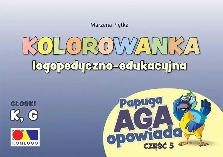 Kolorowanka logopedyczno-edukacyjna ,,Papuga Aga opowiada. Część 5 - k, g" - to zeszyt z 10 rysunkami do kolorowania, po jednym z każdej z 10 historyjek zestawu ,,Papuga Aga opowiada. Część 5". Uzupełnieniem ilustracji są wyrazy i teksty zawierające głoski: k, g.
