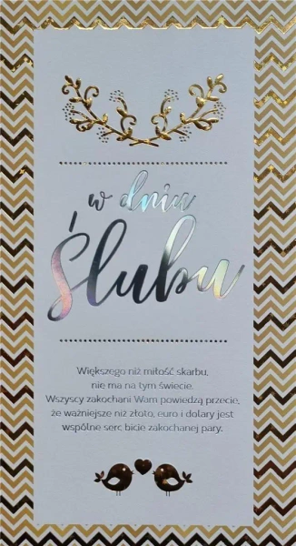 Pięknie wykończony karnet z okazji ślubu. Wewnątrz karnetu znajdują się dedykowane życzenia.Pamiętaj: prezentowany karnet może różnić się odcieniem od tego widocznego na zdjęciu.