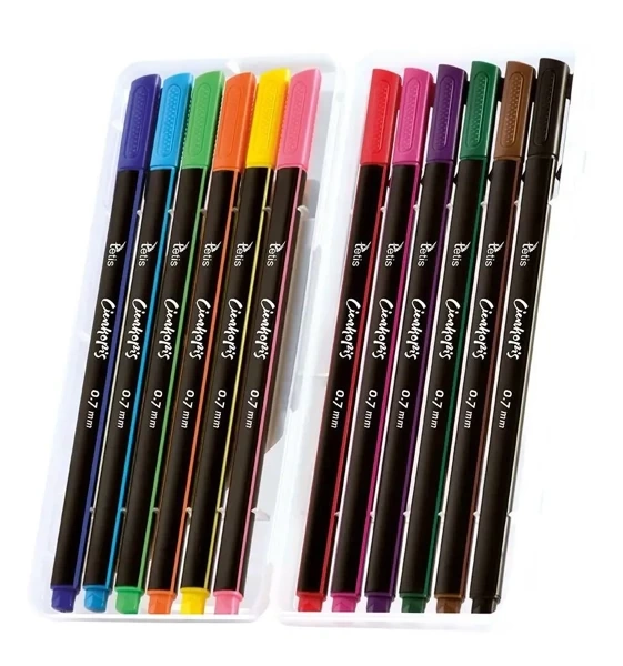W ofercie prezentujemy zestaw 12 cienkopisów z trójkątną obudową. Są one notowane za swoje żywe, długotrwałe kolory. Każdym ruchem pióra na papierze otrzymujesz precyzyjną linię pisania o grubości 0,4 - 0,5 mm, dzięki fibrowej końcówce o średnicy 0,7 mm.Bezpieczne i łatwe w użyciu