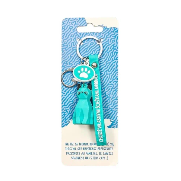Ten wyjątkowy brelok przedstawiający kota został zaprojektowany w geometrycznym stylu. Jego kształt jest nienachalnie wyrazisty dzięki metalowemu kółku oraz karabińczykowi.Dodatkowe Detale Produkt zawiera również silikonowy pasek z notatką w języku polskim - zmysłowym dodatkiem, który nadaje mu osobistego charakteru. Osobliwością tego breloka jest również zawieszka z odciskiem łapki - urocze, małe detale, które przyciągają uwagę i sprawiają, że jest to idealny prezent dla miłośników zwierząt. Więcej niż tylko ozdoba, brelok ten jest symbolem miłości do futrzastych przyjaciół.
