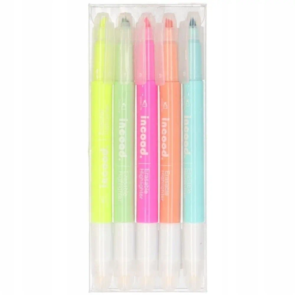 Nasza oferta obejmuje komplet pięciu różnobarwnych zakreślaczy od INCOOD. Każdy z nich pokryty jest łatwo zmywalnym atramentem, co daje możliwość poprawiania błędów, ale również daje swobodę twórczą. Stworzony z myślą o kreatywnych osobach, bez względu na wiek!