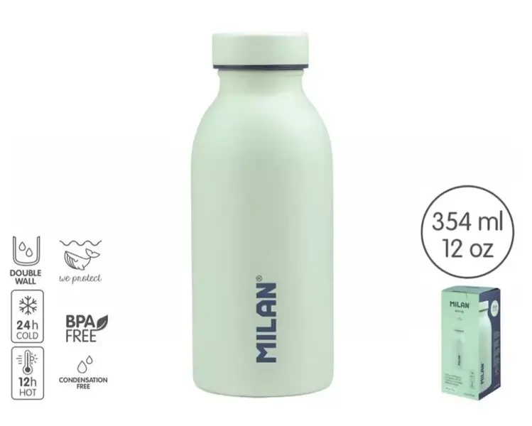 To urokliwe niewielkie naczynie utrzymane jest w tonacji zieleni i zostało stworzone ze stali nierdzewnej odznaczającej się odpornością na korozję. Głównym zadaniem, które spełnia, jest utrzymanie ciepła lub zimna napoju przez długi czas. Butelka posiada zakrętkę gwarantującą pełną szczelność, dzięki zintegrowanej uszczelce z polipropylenu. System ochronny oparty na dwudziestoczterogodzinnej izolacji próżniowej gwarantuje świeżość i optymalną temperaturę napojów chłodnych przez całą dobę. Jeśli zależy Ci na ciepłych płynach, efekt utrzymania temperatury jest możliwy do osiągnięcia na poziomie 12 godzin. Dodatkową zaletą tej metody izolacji jest brak skraplania na zewnątrz butelki. Gdy trzymasz butelkę w dłoniach lub przenosisz w torbie, zauważysz, że jest zawsze w temperaturze pokojowej. Butelka nie będzie powodować niekomfortowego uczucia zimna lub ciepła. Dzięki temu, produkt doskonale sprawdzi się jako termos na gorące napoje. Butelka nie zawiera szkodliwego BPA, więc picie z niej jest całkowicie bezpieczne. Woda przechowywana w termosie utrzymuje swoją świeżość oraz smak. Korzystając z butelek wielokrotnego użytku, aktywnie dzięki temu przyczyniasz się do ograniczenia konsumpcji jednorazowych naczyń plastikowych. Objętość naczynia to 345 ml, przy określonych wymiarach: wysokość 17,1 cm, średnica 6,85 cm oraz waga wynosząca 200 gramów.EAN: 8411574093978