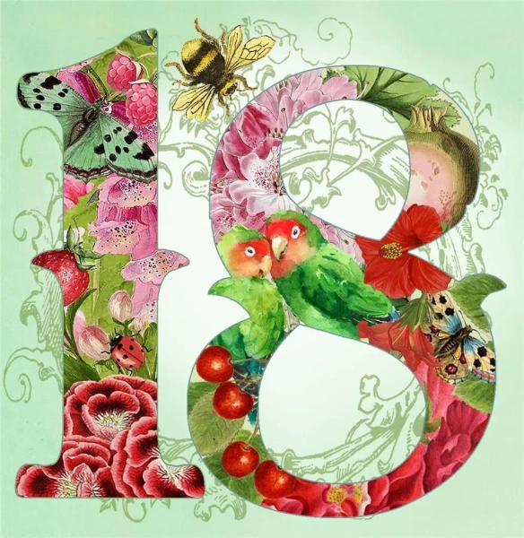 Kwadratowy kartonik urodzinowy z kopertą „18” od Madame Treacle