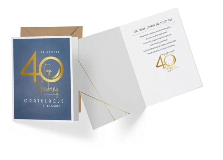 Proponowany Karnet Urodzinowy V-011, wytworzony w rozszerzonym, tzw. Angielskim formacie o wymiarach 140x190 mm, charakteryzuje się szczególną precyzją wykonania. Zdobienia folią holograficzną, a także pokrycie całkowite folią matową nadają mu prosty i elegancki wygląd. W środku karnetu znajduje się tekst życzeń, co czyni go idealnym prezentem dla osób obchodzących swoje 40-te urodziny. Do każdego karnetu dołączona jest dedykowana koperta, co stanowi uzupełnienie oferowanego produktu.Podsumowanie