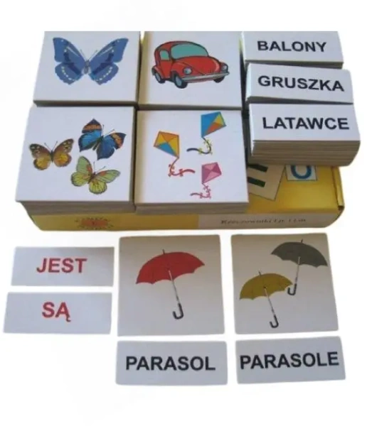 Zestaw plakietek i etykietek służy do przenoszenia obrazów z rzeczywistości na obrazki, uświadamianiu dziecku, że słowo (napis) oznacza konkretną rzecz, czynność czy sytuację oraz do nauki czytania. Uczy dziecko rozumienia pytań oraz udzielania odpowiedzi.Zestaw ten służy do uświadamiania dziecku zmiany formy wyrazu w przypadku pojawienia się większej ilości elementów np.: PIES - PSY, poprzez podanie odpowiedniej plakietki, etykietki.Uczy segregacji plakietek i etykietek na dwa zbiory: JEST - SĄUczy czytania całymi wyrazami (czytanie globalne) poprzez dokładanie etykietek do odpowiednich plakietek.- 40 kolorowych elementów obrazkowych
