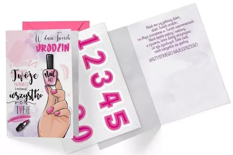 Rozmiar kartki B6, to jest 16,6 x 11,7 cm po złożeniu, jest odpowiedni dla tej zaprojektowanej z myślą o szczególnym dniu. Do zestawu kartki dołączona jest kolorowa koperta, co dodaje wytworności całości. Dekoracje na kartce są różnorodne i bogate, a ich wybór zależy od wybranego wzoru. Znalazły się tu między innymi przyklejone ozdoby, elementy biżuteryjne, odstawniki, brokat oraz metaliczne folie. Ta kartka to perfekcyjny dodatek do prezentu urodzinowego, który sprawi, że każda jubilatka poczuje się wyjątkowo.EAN: 5901924475415